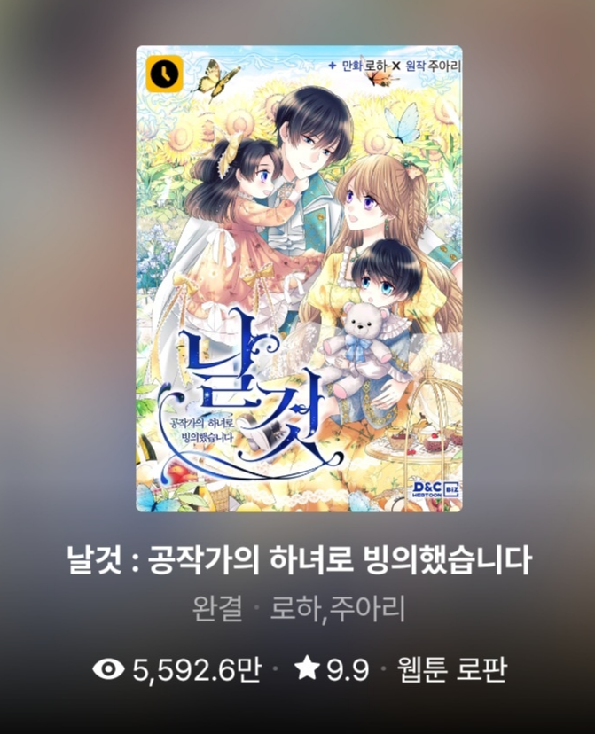 너무 재미있게 본 작품입니다. 소설로도 있지만 저는 웹툰으로 보았습니다. 저주로 고통스런 나날을 보내는 어린 리안드리에게 빙의된 여주와의 이야기에 푹 빠져서 보았던 기억이 있어 추천합니다.^^