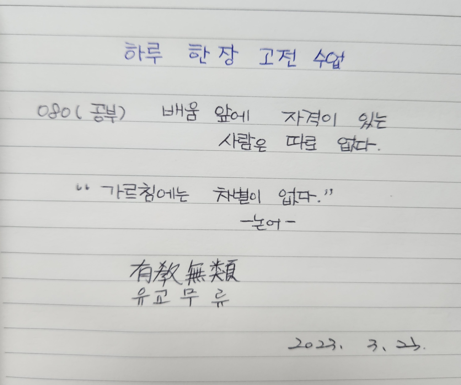 학창시절에 배움이 끝이 있는줄 알았었는데 배움에는 끝이 없고 누구나 배우고자 하면 언제 어디서든 배울수 있어야 한다는 것을 알게되었습니다. 공자의 대단한 실천이 어려운 시대에 도움이 되었듯이 저도 배움을 통해 저도 성장하고 후에 누군가에게 도움이 될수 있도록 배움을 게을리 하지 않겠습니다.