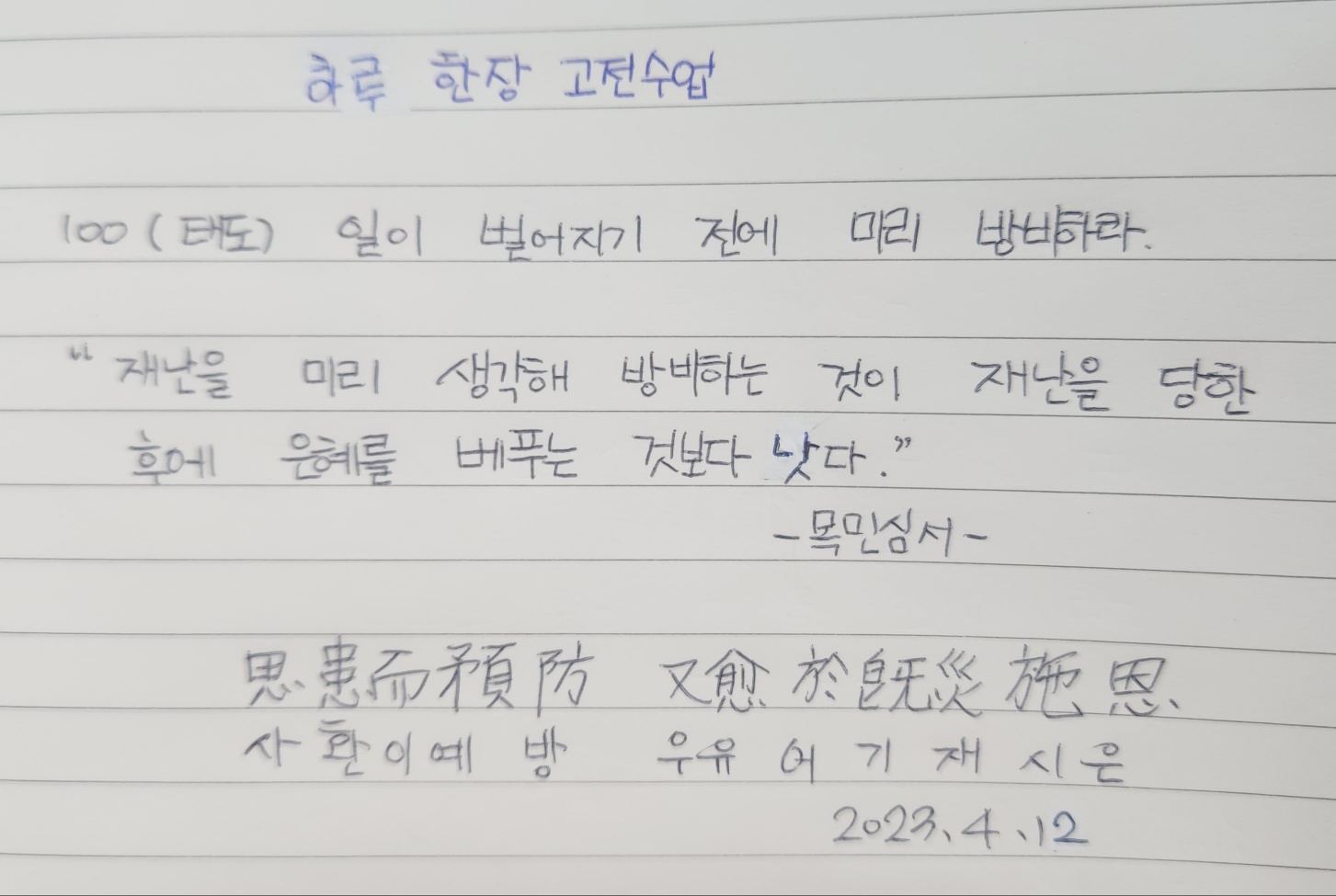 오늘의 고전수업은 정말 당연한 것인데도 우리는 미리 방비 하지않고 일이 일어나고 난 뒤에야 해결한것을 많이 볼수 있었습니다. 저 또한 마찬가지로 일이 생기고 나서 해결하려고 했던일들이 있습니다. 일이 일어나고 해결하려 하면 몇배는 많은 시간과 노력이 들어가야 하는지 깨닳았습니다.