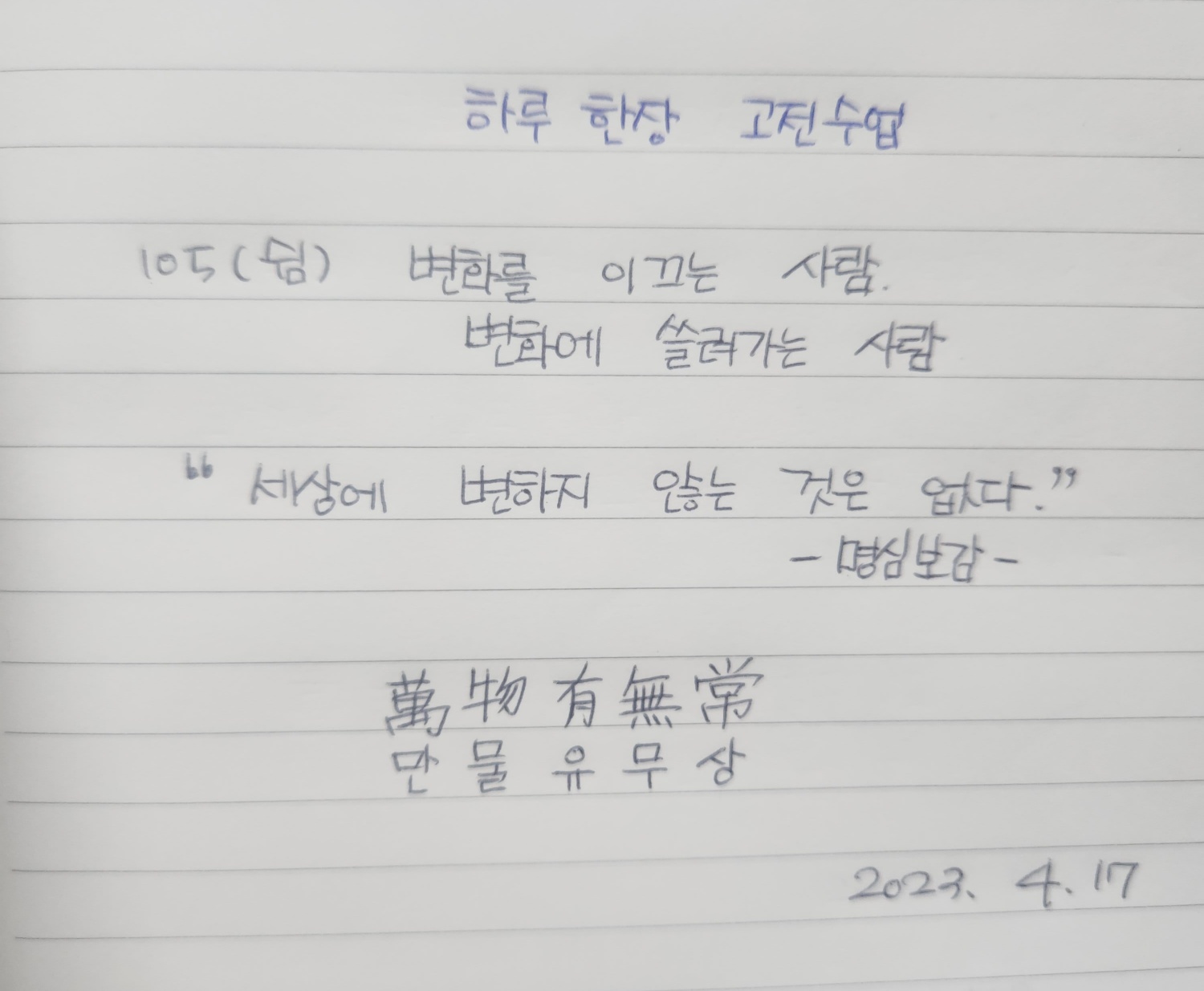 변화는 운명이라는 저자님의 말씀과 오늘의 고전수업을 잊지 않고 되새김하는 하루를 보내도록 하겠습니다.