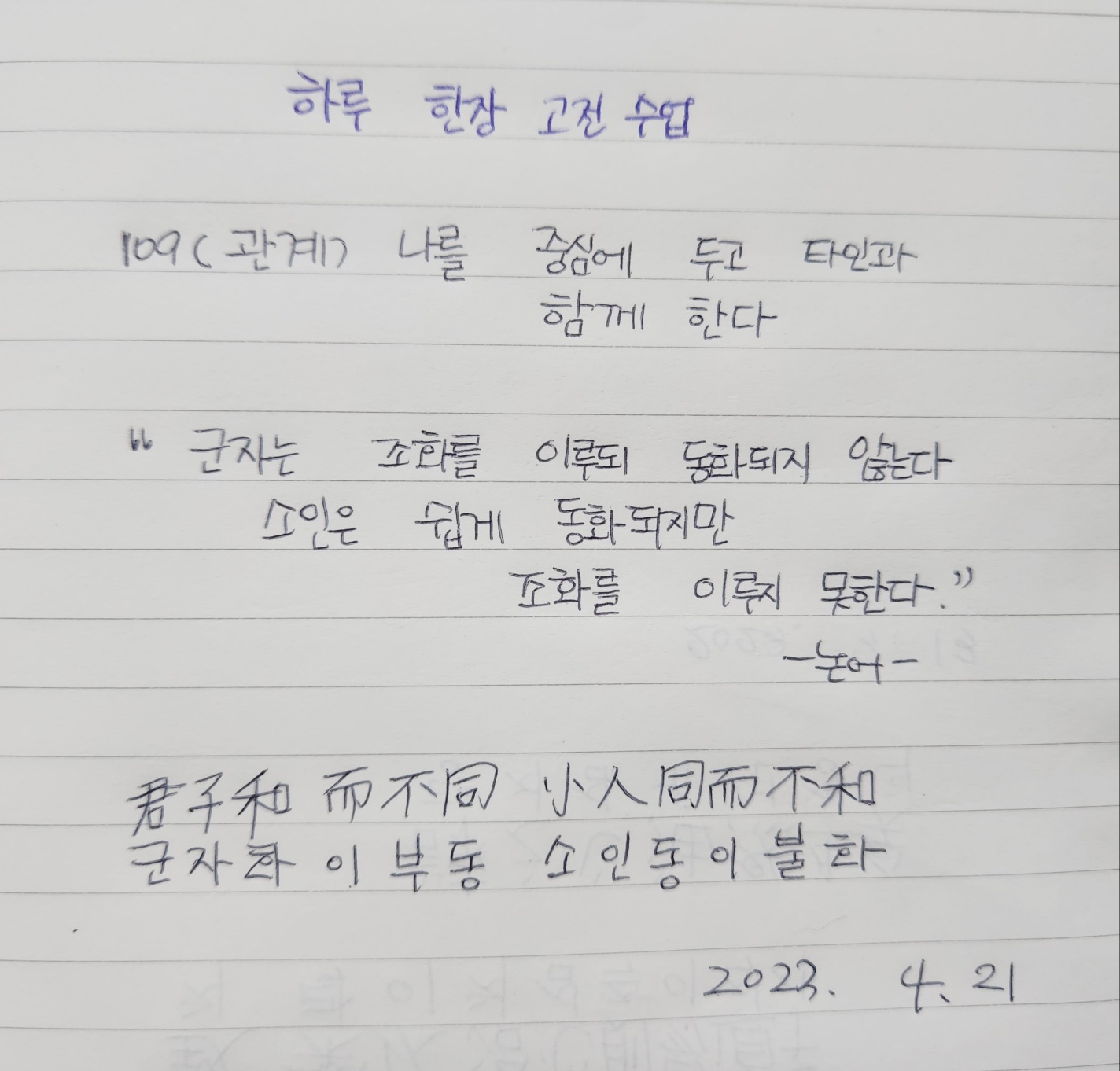 "군자는 조화를 이루되 동화되지 않는다. 소인은 쉽게 동화되지만 조화를 이루지 못한다."