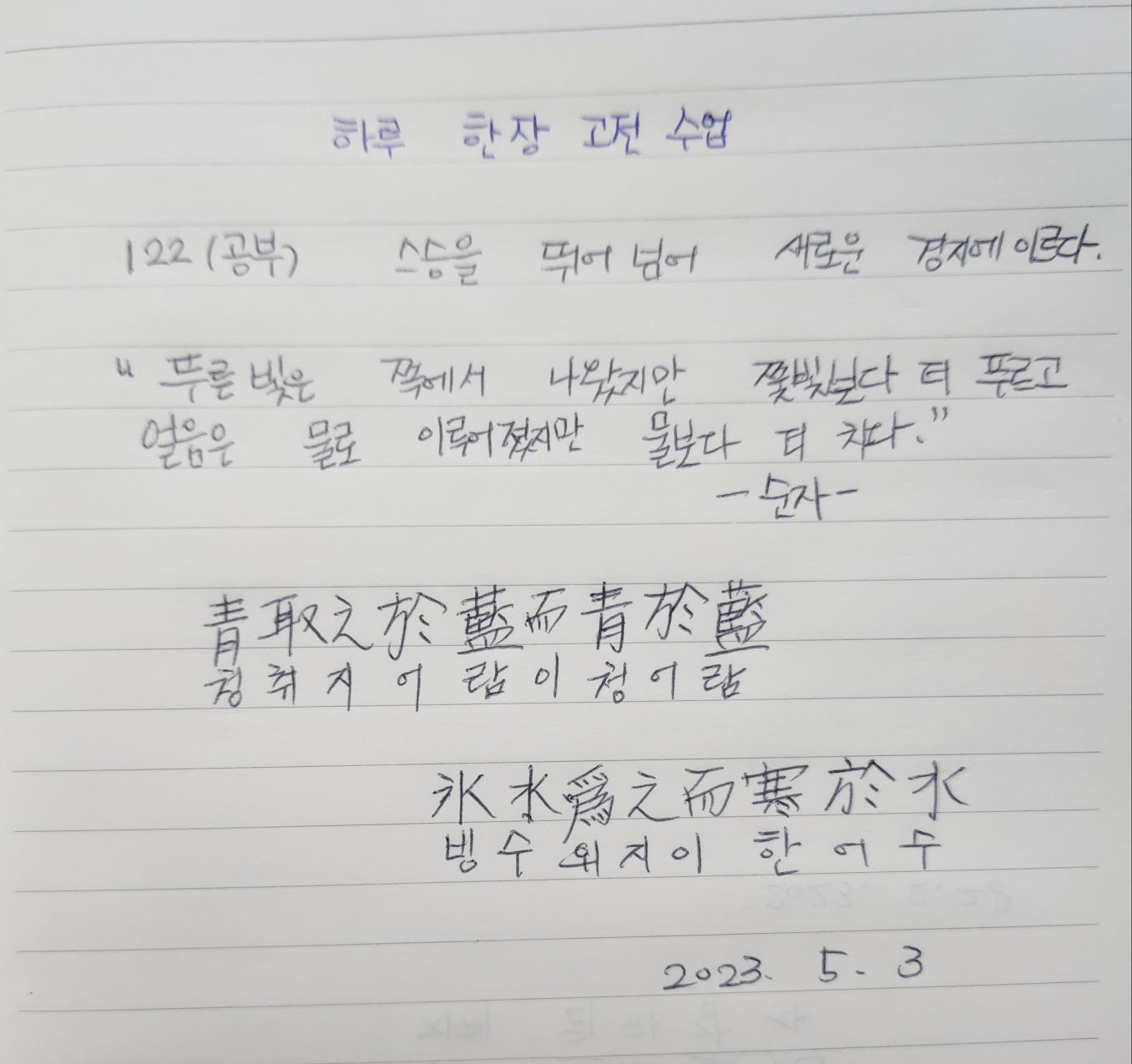 오늘의 고전수업은 조금 어렵다고 느껴집니다. ' 스승을 뛰어넘어 새로운 경지에 이르다'  학문을 멈추어서는 안된다라고 이야기 하고 있는 것 같습니다. 배움이 높은 산에 오르는 것과 같다라고 하심은 그 만큼 힘듬이 없이는 경지에 이루지 못하다는 것입니다.