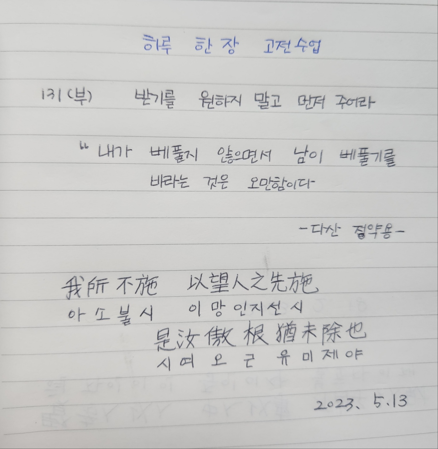 "내가 베풀지 않으면서 남이 베풀기를 바라는 것은 오만함이다."
