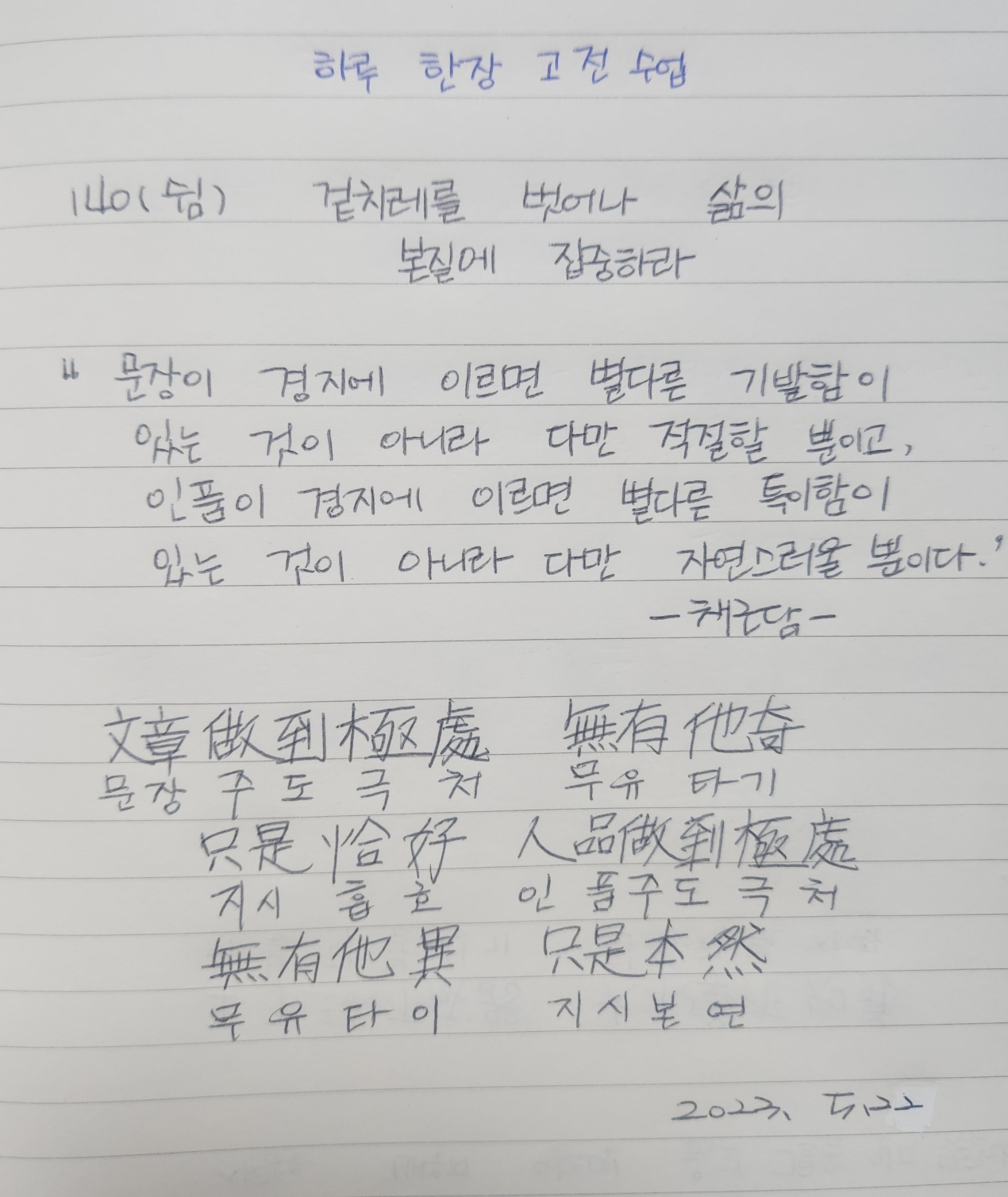 " 문장이 경지에 이르면 별다른 기발함이 있는 것이 아니라 다만 적절할 뿐이고, 인품이 경지에 이르면 별다른 특이함이 었는 것이 아니라 다만 자연스러울 뿐이다. "-채근담