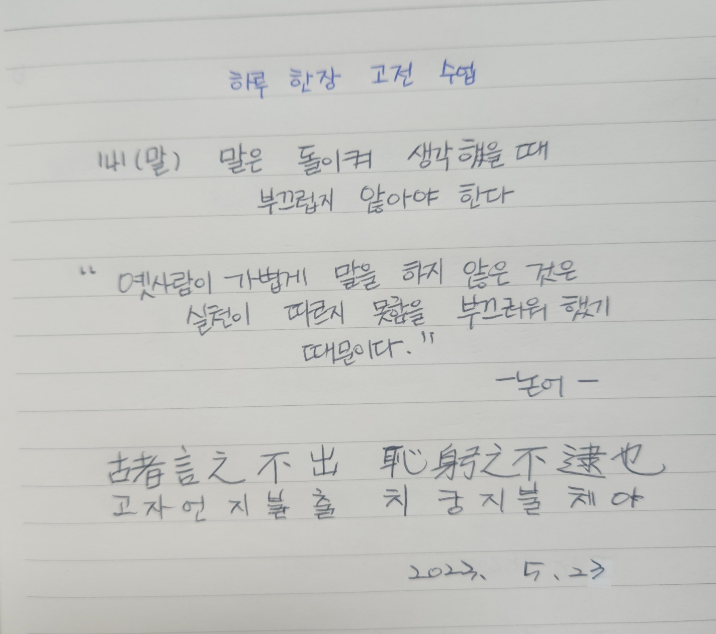 "옛사람이 가볍게 말을 하지 않은 것은 실천이 따르지 못함을 부끄러워했기 때문이다."