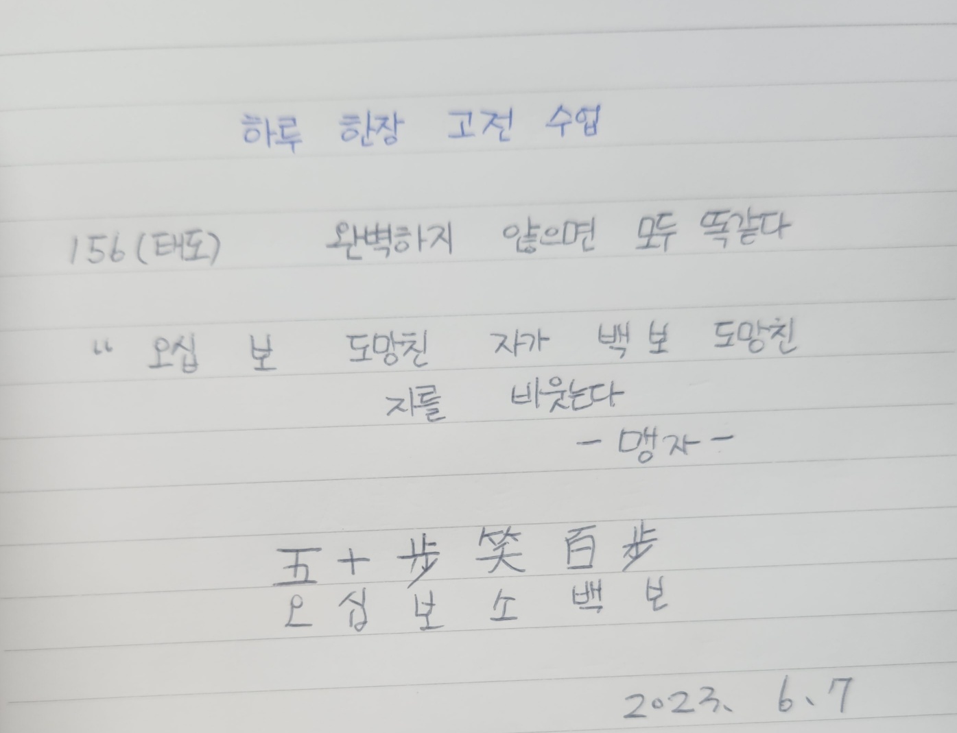 그러자 맹자는 전쟁에 비유해 다음처럼 말해준다. 전쟁에서 오십 보 도망한 자가 백 보 도망한자를 비웃을 수 없듯이, 제대로 왕도정치를 베풀지 못한다면 다른 나라보다 조금 낫다고 해도 자랑할 만한 것이 못된다는 뜻이다.