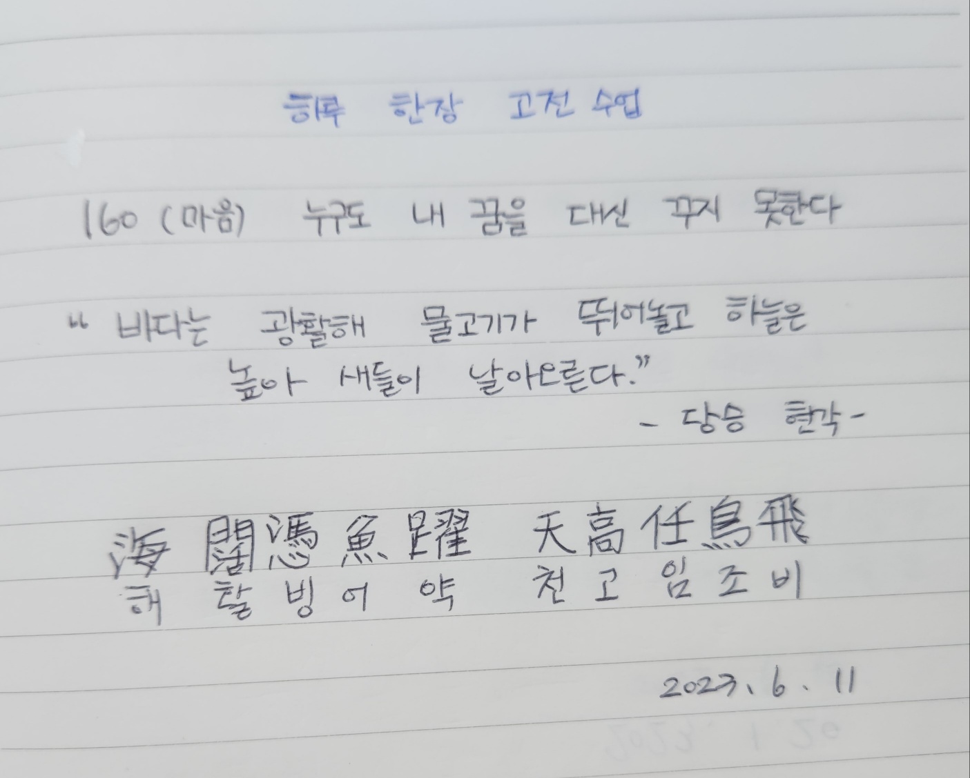 나의 꿈을 위해 스스로 기준을 낮추지 말고 할수 있다고 이야기 해주시는것 같습니다. 저도 꿈을 향해 가고 있지만 간혹 힘들때가 있습니다. 지금 고전수업이 저를 단단하게 해주는 역할을 해주는것 같아 너무 감사합니다.