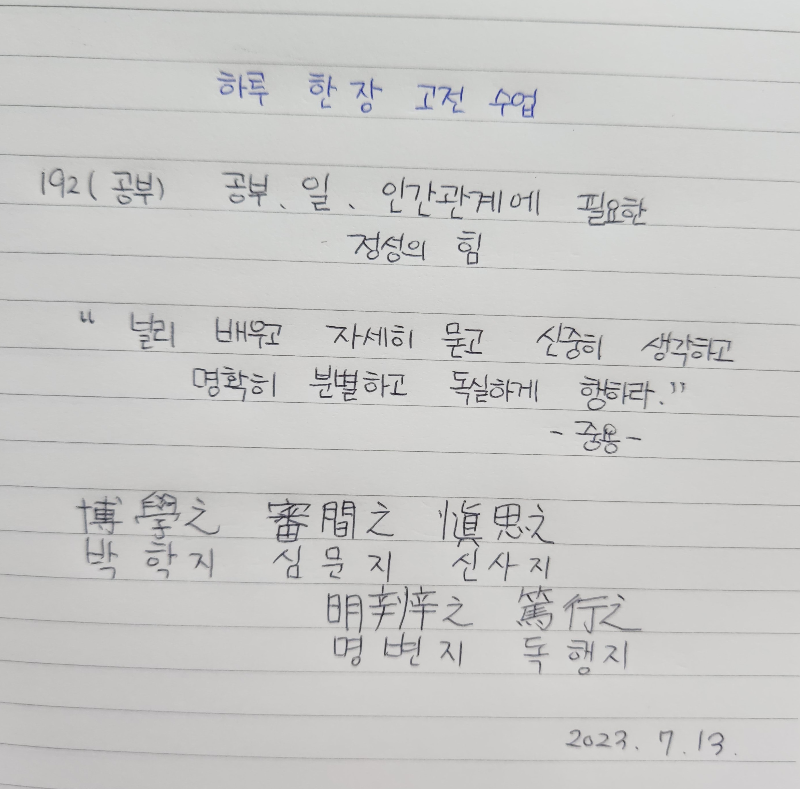 "널리 배우고 자세히 묻고 신중히 생각하고 명확히 분별하고 독실하게 행하라."