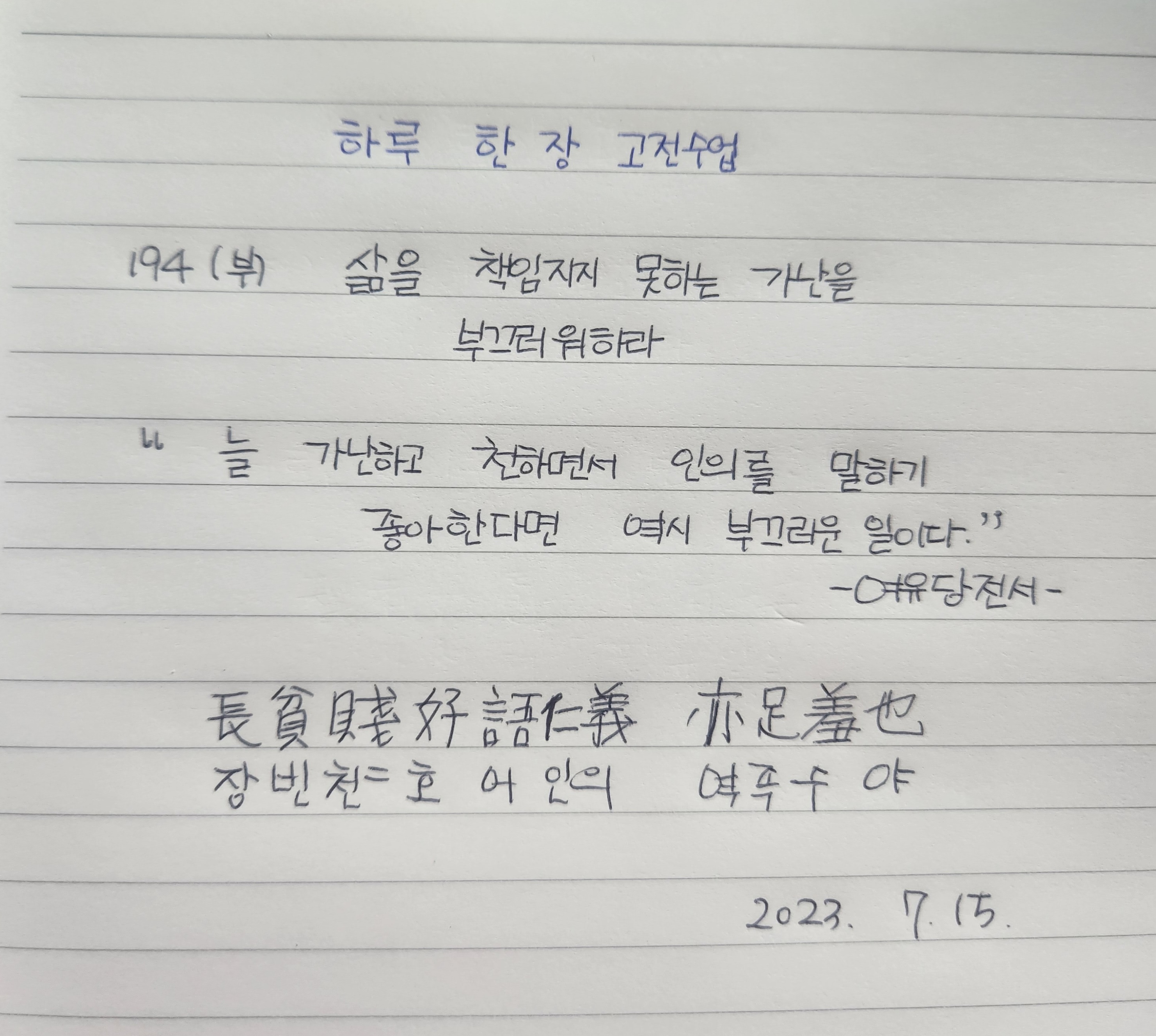 "늘 가난하고 천하면서 인의를 말하기 좋아한다면 역시 부끄러운 일이다."