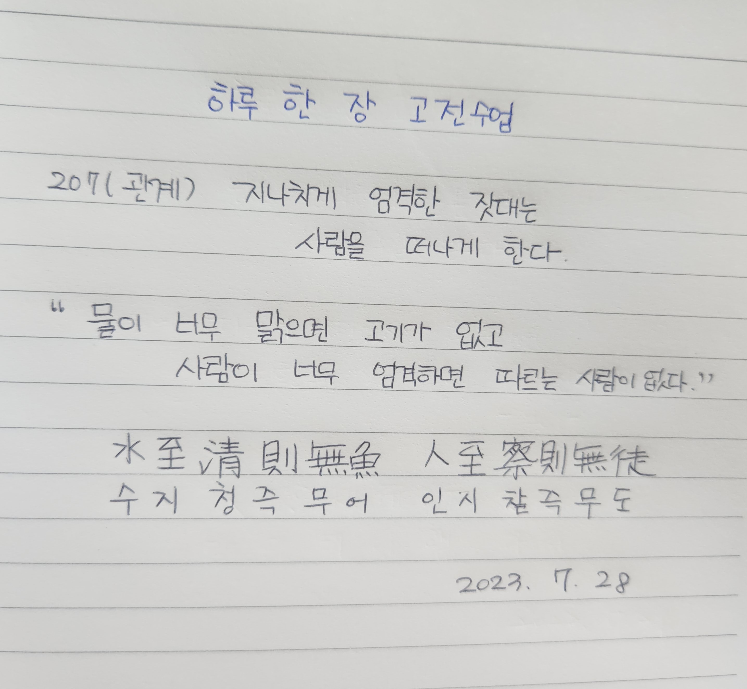 "물이 너무 맑으면 고기가 없고 사람이 너무 엄격하면 따르는 사람이 없다."