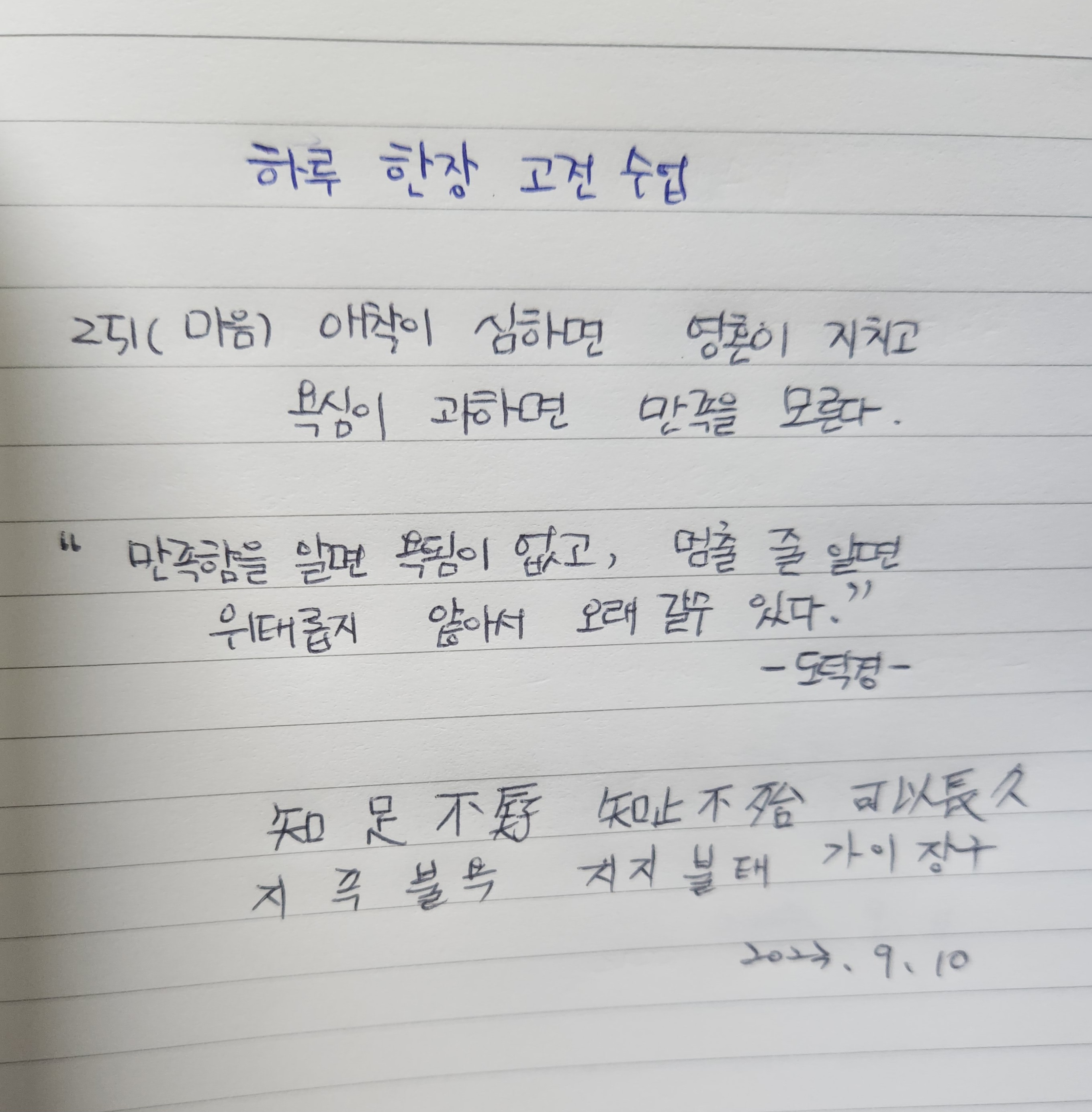 "만족함을 알면 욕됨이 없고, 멈출 줄 알면 위태롭지 않아서 오래 갈 수 있다."