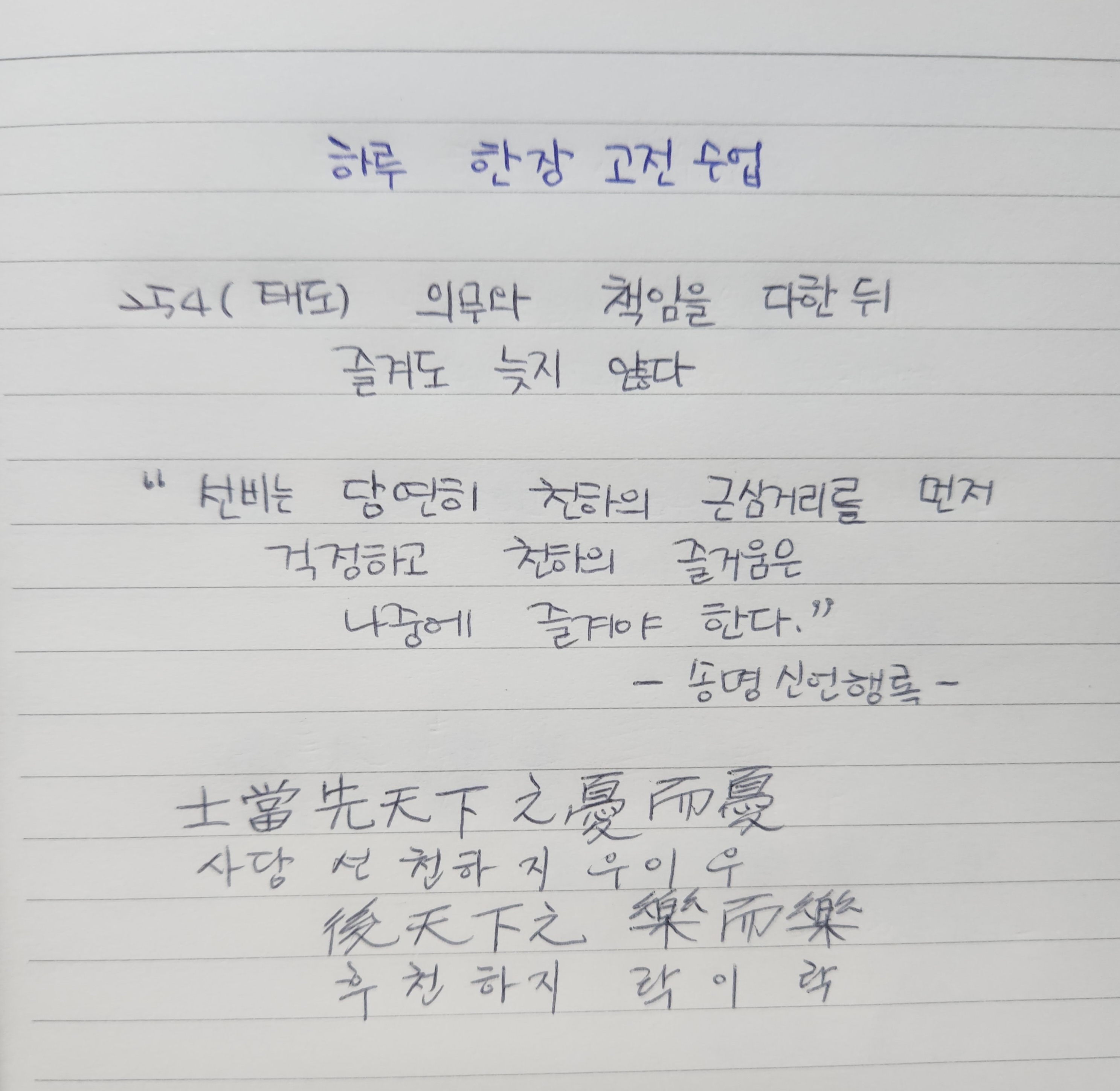 "선비는 당연히 천하의 근심거리를 먼저 걱정하고 천하의 즐거움은 나중에 즐겨야 한다."